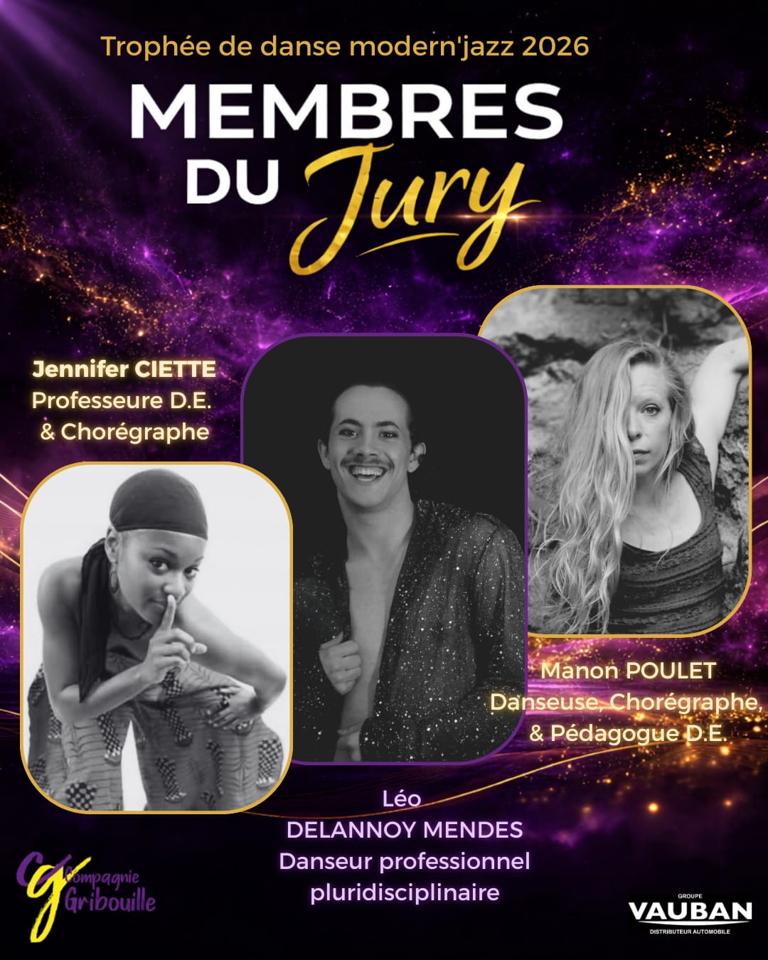 Nous sommes heureux de vous présenter les 3 professionnels de la danse qui constitueront cette année le jury du Trophée de Danse Modern’Jazz du Val d’Oise 2026 !